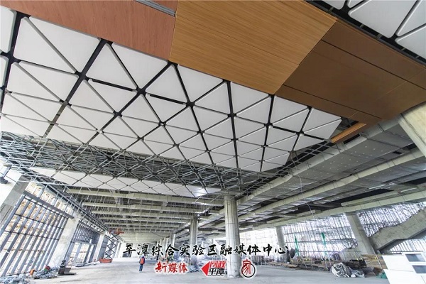 5日上午,記者首先來到福平鐵路平潭站一樓的候車廳內(nèi),只見,偌大的候車廳按照施工進(jìn)度的先后,被自然地分成幾個區(qū)域。在候車廳的正中間位置,候車廳的吊頂用一塊塊白色的三角形鋁板拼接起來,白色鋁板吊頂?shù)闹虚g,搭配著褐色的木紋鋁板,整體風(fēng)格顯得清新簡約,時尚大氣,這就是未來候車廳的吊頂樣板。