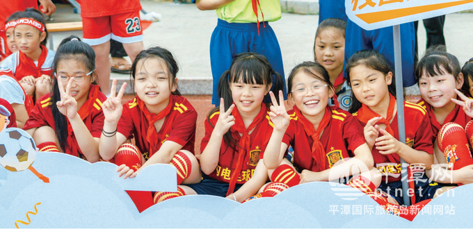 在平原中心小學,場上學生在踢足球,場下啦啦隊在助威