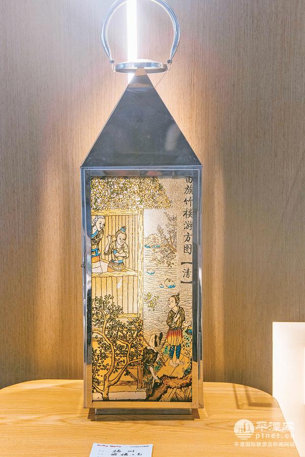 福州玻璃工藝品上雕刻著清代的苗族竹樓游方圖