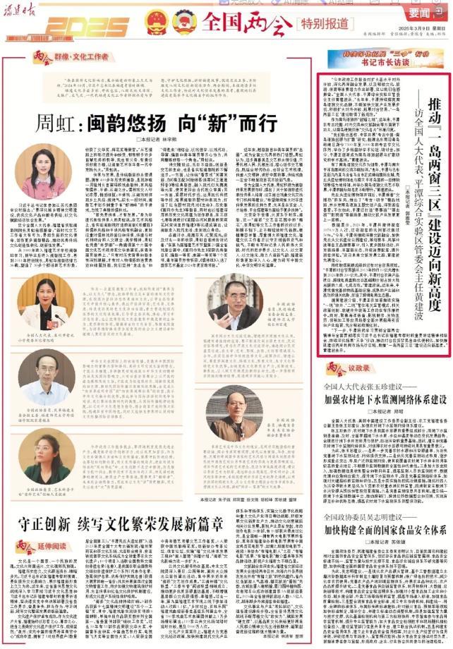 “今年政府工作報告對擴大高水平對外開放,深化兩岸融合發展,以及釋放文化、旅游、體育等消費潛力作出部署,這讓我們倍感振奮。”全國人大代表、平潭綜合實驗區管委會主任黃建波說,“去年來,平潭持續擦亮南島語族文化品牌,不斷加快文旅產業發展步伐,積極擴大對外開放、拓展對臺貿易,‘一島兩窗三區’建設取得了新成效。”