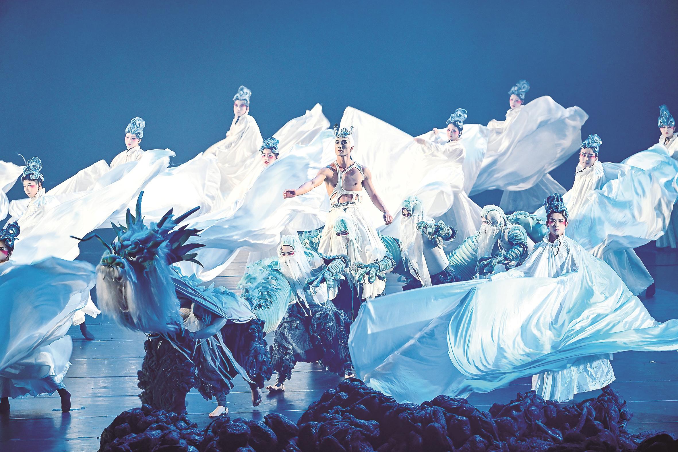 “平潭映象”駐場首演現(xiàn)場,舞者衣袂翩然,如龍游云海,演繹神話意境。江信恒 攝