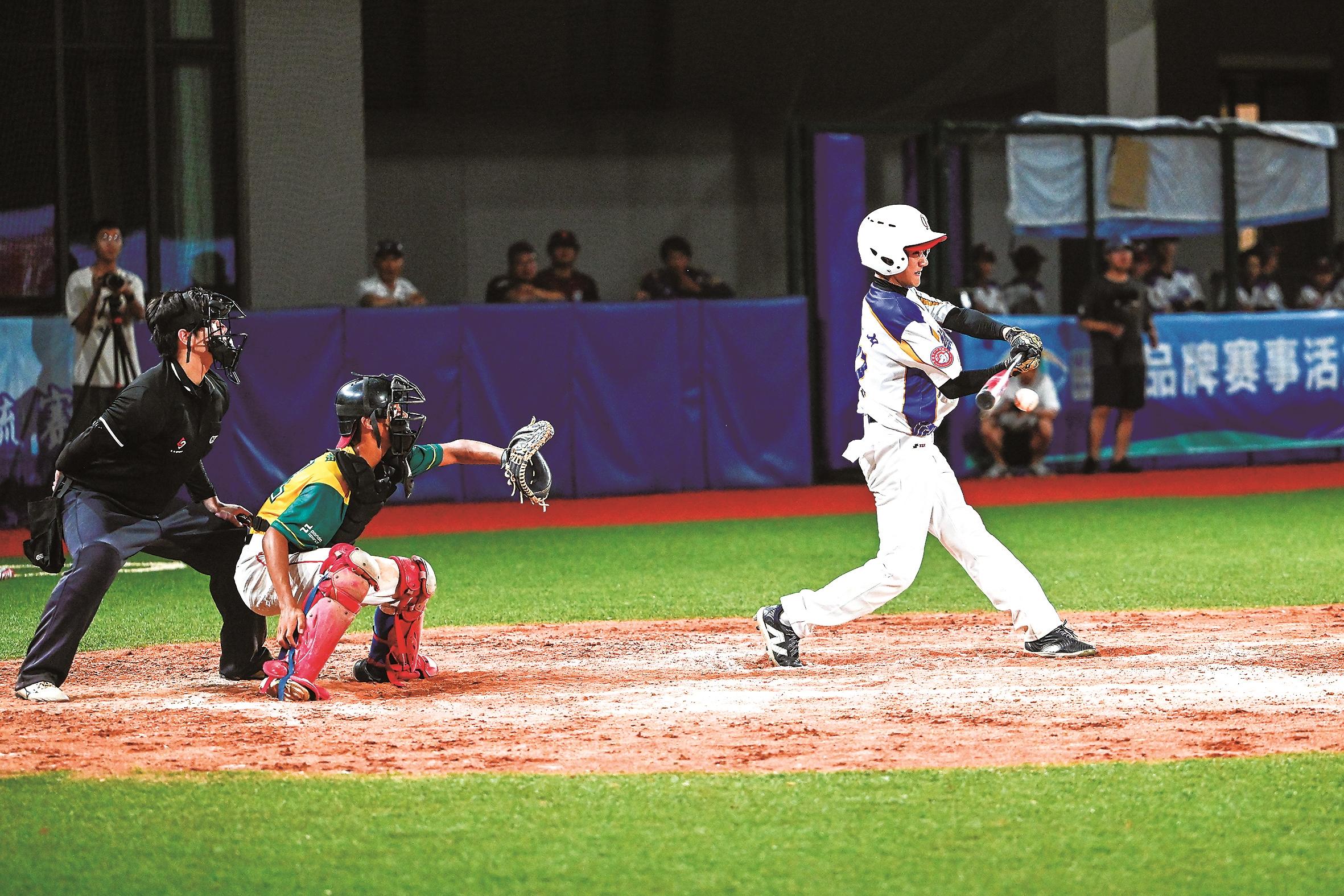 平潭澳門體育月,平潭一中隊(白)對戰(zhàn)澳門熊貓隊(黃)棒球交流賽比賽現(xiàn)場。 江信恒 攝