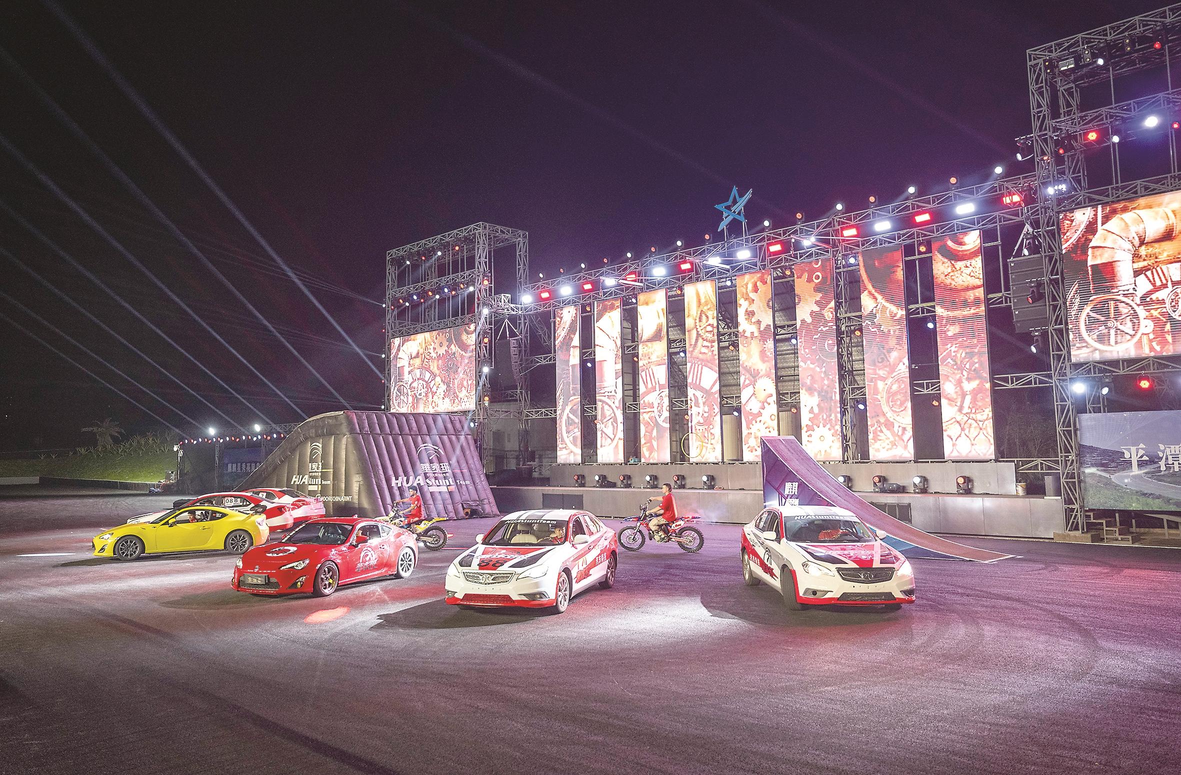 麒麟星秀國際汽特廣場汽車特技表演現(xiàn)場,燈光與引擎轟鳴交織。林君斌 攝