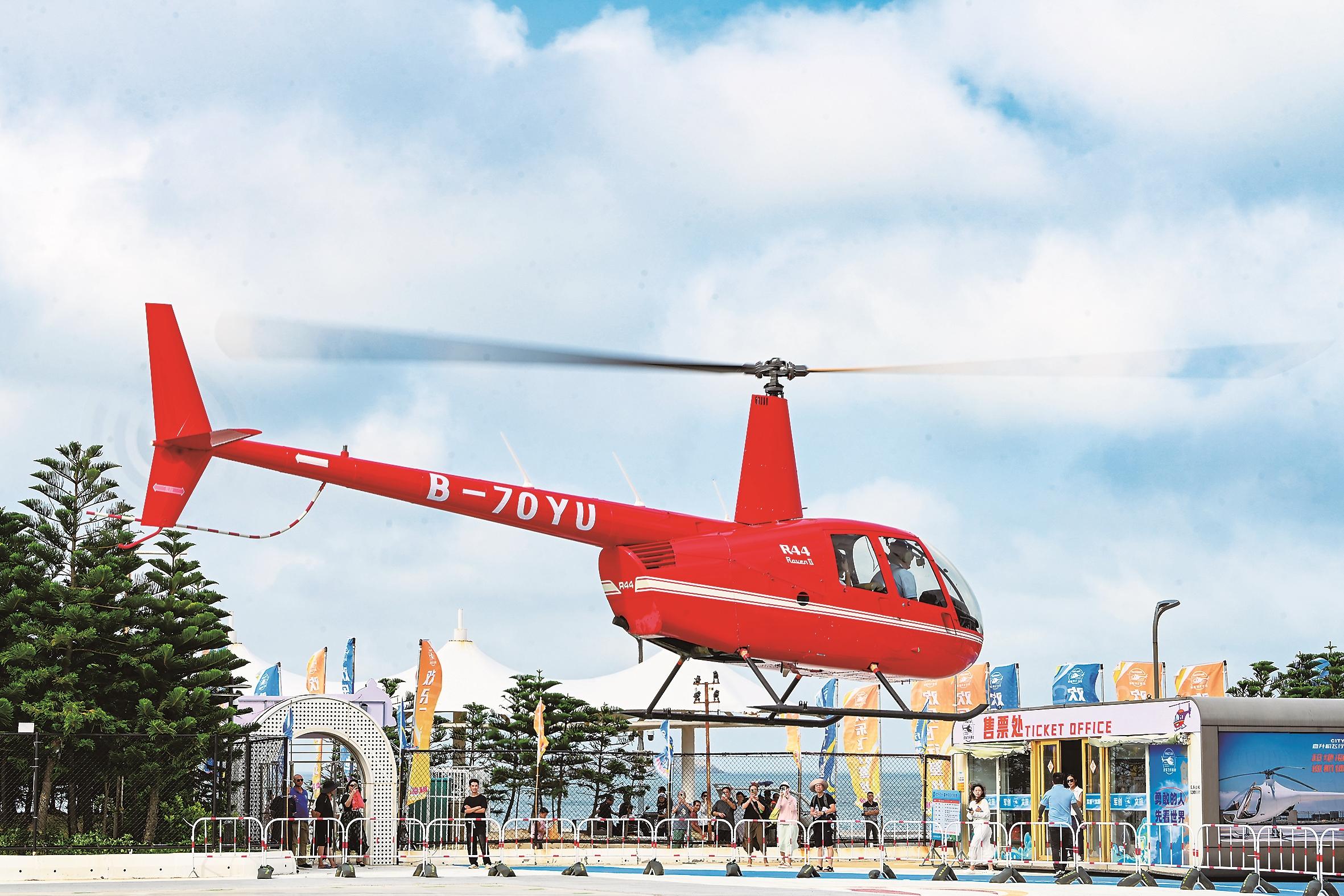 在龍王頭海洋公園,游客乘直升機開啟空中俯瞰平潭的獨特體驗。 林君斌 攝
