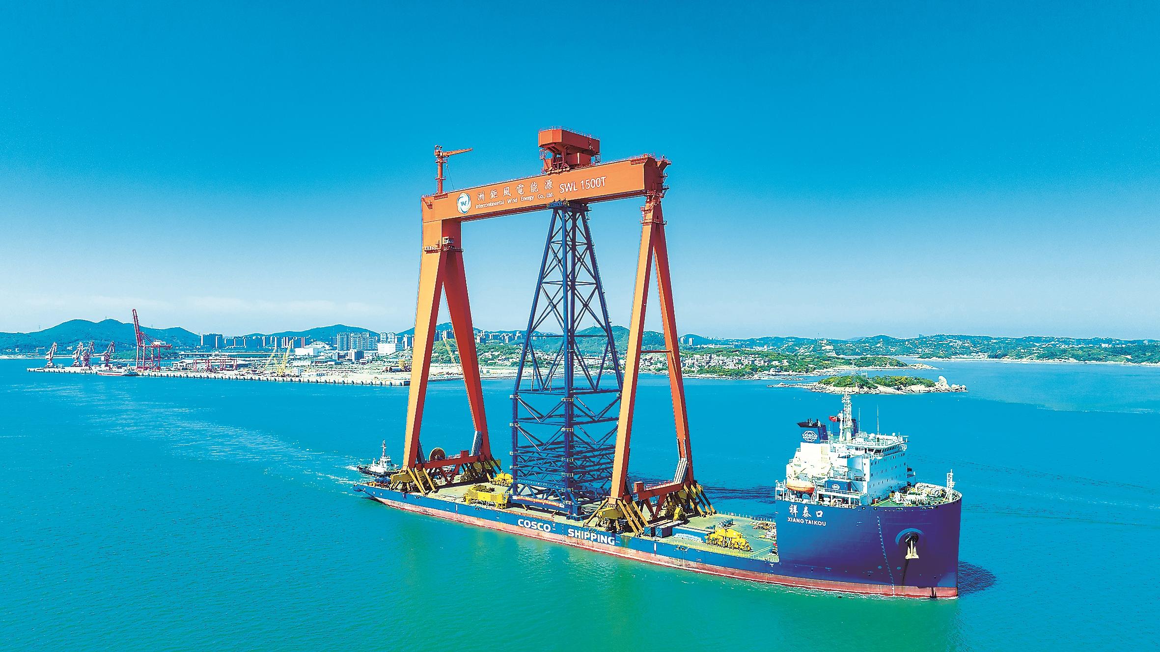 全國整機運輸單體最大的臺灣洲鉅風(fēng)電能源1500噸型龍門吊,在福州港平潭港區(qū)完成整機裝船,起航運往臺灣。林君斌 攝