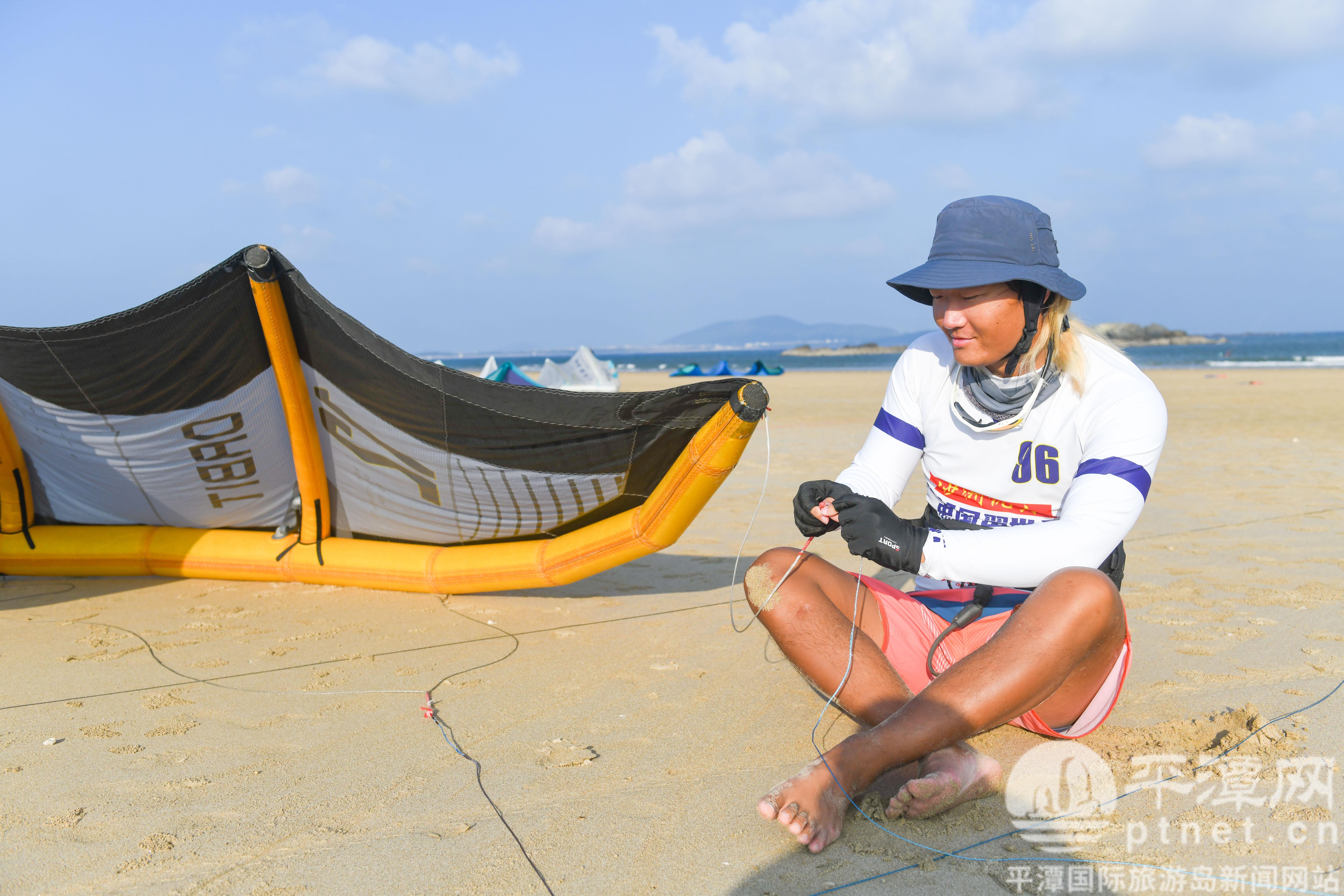 海風(fēng)獵獵,鄭浩楠剛結(jié)束一輪酣暢的滑行,正俯身整理纏繞的風(fēng)箏線。發(fā)梢滴落著咸澀的海水,黝黑的皮膚記錄著他在平潭與陽光和海浪相伴的每一天。
