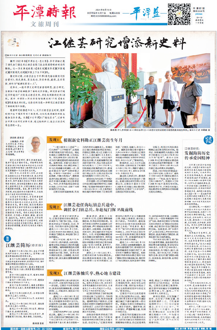 據(jù)史料記載,江繼蕓出生于平潭(清代屬海壇鎮(zhèn)侯均區(qū)右營村),精武善戰(zhàn),屢立戰(zhàn)功,歷任參將、副將、總兵等職,被譽(yù)為“福建抗英第一人”。江永平表示,該書的出版旨在真實(shí)、立體、全面地展現(xiàn)江繼蕓的英雄形象,客觀呈現(xiàn)其在鴉片戰(zhàn)爭時期的戎馬生涯與愛國精神,幫助讀者更加清晰地認(rèn)識這位民族英雄的歷史事跡。