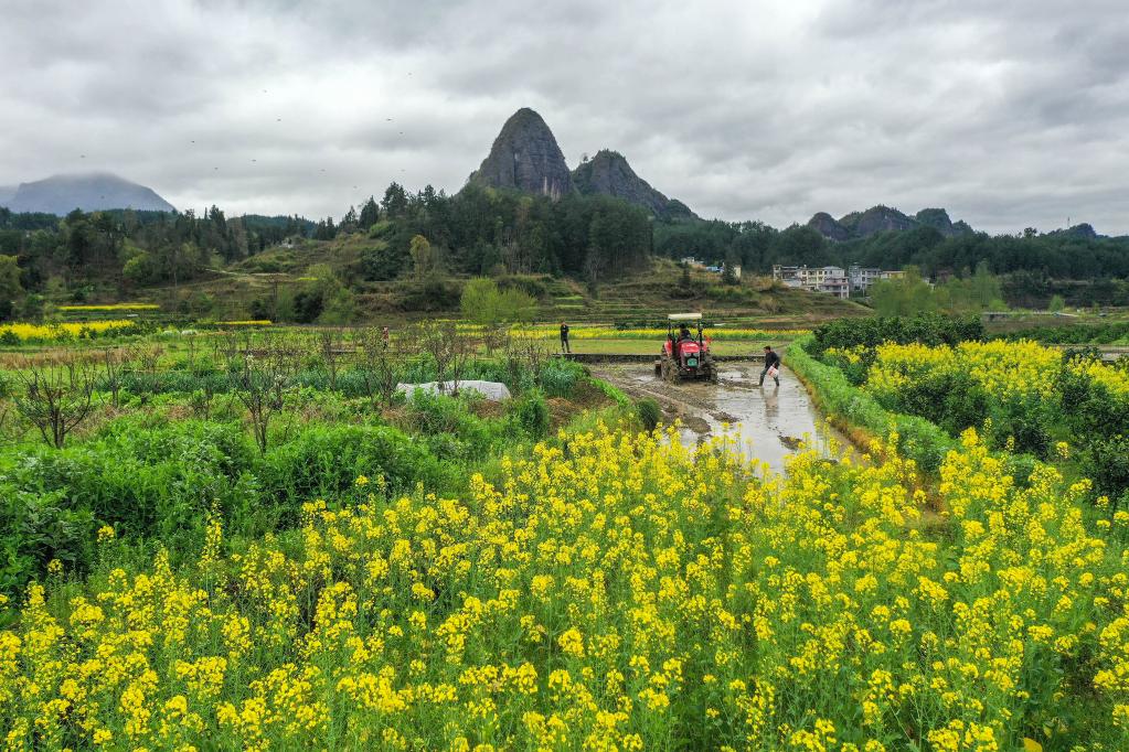 3月20日,湖南省湘西土家族苗族自治州龍山縣興隆街道,農民在田間耕作(無人機照片)。新華社發(曾祥輝攝)