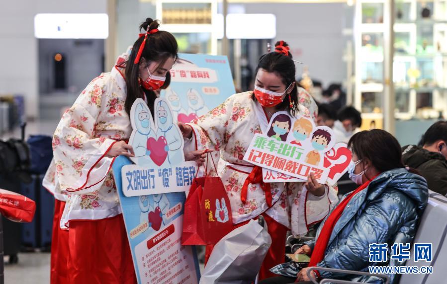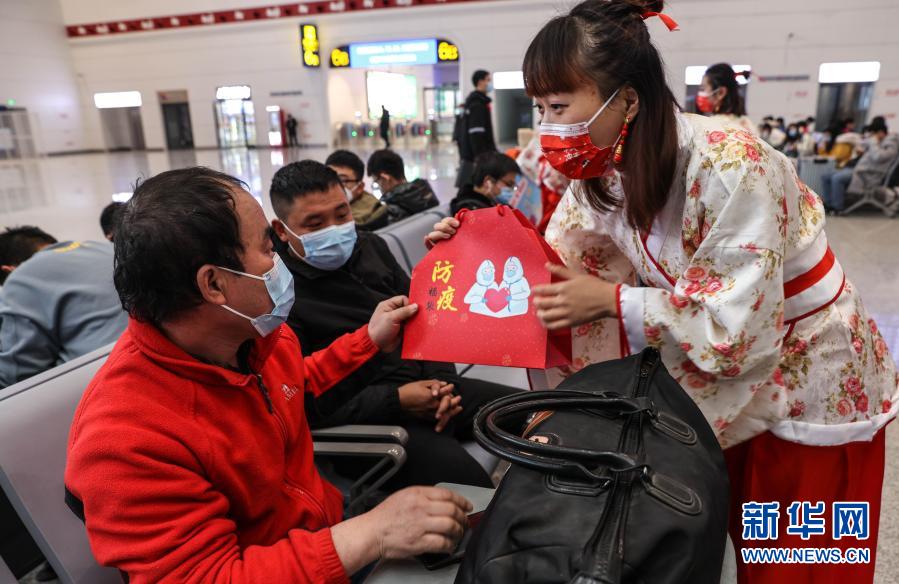 當(dāng)日,中國(guó)鐵路上海局集團(tuán)有限公司徐州直屬站徐州東站的“順心”雷鋒服務(wù)臺(tái)的客運(yùn)工作人員身著“漢服”,為候車(chē)的旅客宣傳防疫知識(shí),并為部分旅客送上裝有宣傳卡、口罩等防疫物品的自制福袋。