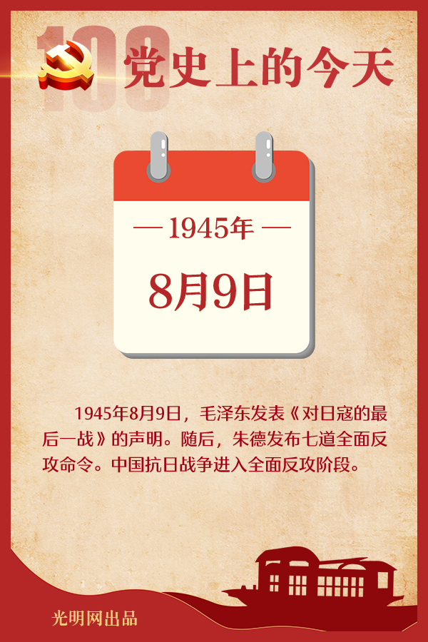 8月9日 毛澤東發表《對日寇的最后一戰》的聲明。隨后,朱德發布七道全面反攻命令。中國抗日戰爭進入全面反攻階段。