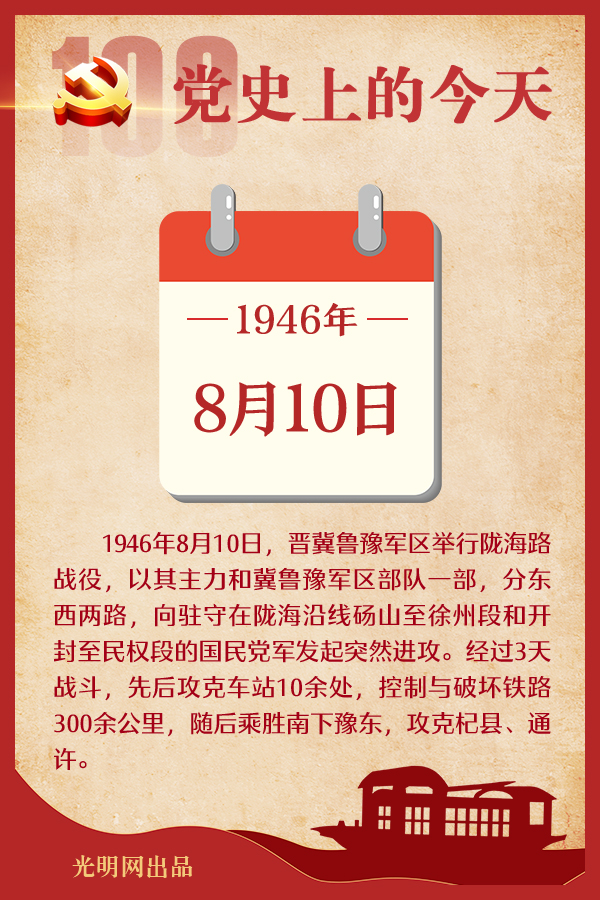 8月10日 晉冀魯豫軍區舉行隴海路戰役。為配合中原和蘇中解放區的作戰,晉冀魯豫軍區決定在開封、徐州間開辟戰場,調動敵人,求得在運動中殲其一部。8月10日起,以其主力和冀魯豫軍區部隊一部,分東西兩路,向駐守在隴海沿線碭山至徐州段和開封至民權段的國民黨軍發起突然進攻。經過3天戰斗,先后攻克碭山、蘭封和楊集、柳河集等車站10余處,控制與破壞鐵路300余公里,隨后乘勝南下豫東,攻克杞縣、通許。