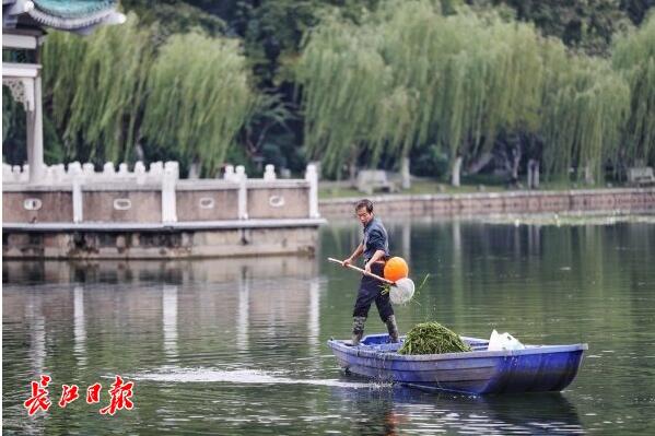 工作人員清理水中的雜草。 記者何曉剛 詹松 李永剛 攝