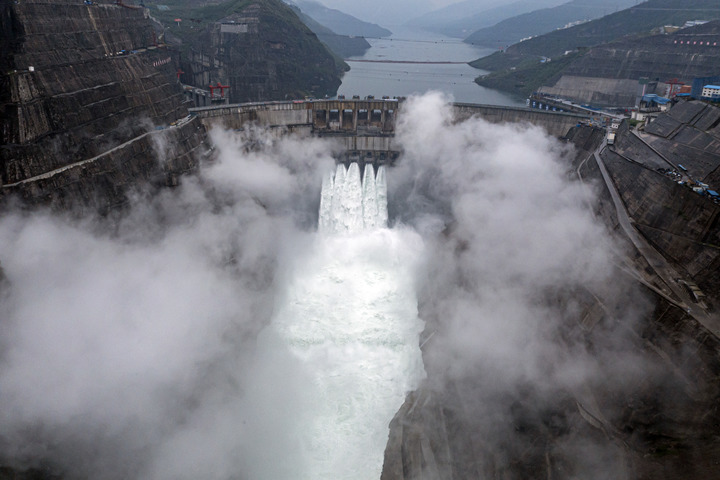 投產(chǎn)發(fā)電中的白鶴灘水電站(無人機(jī)照片)。新華社記者 江文耀 攝
