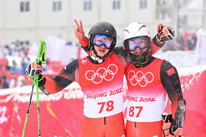 2月13日,中國選手徐銘甫(左)和張洋銘在高山滑雪男子大回轉比賽后合影。新華社記者連振攝