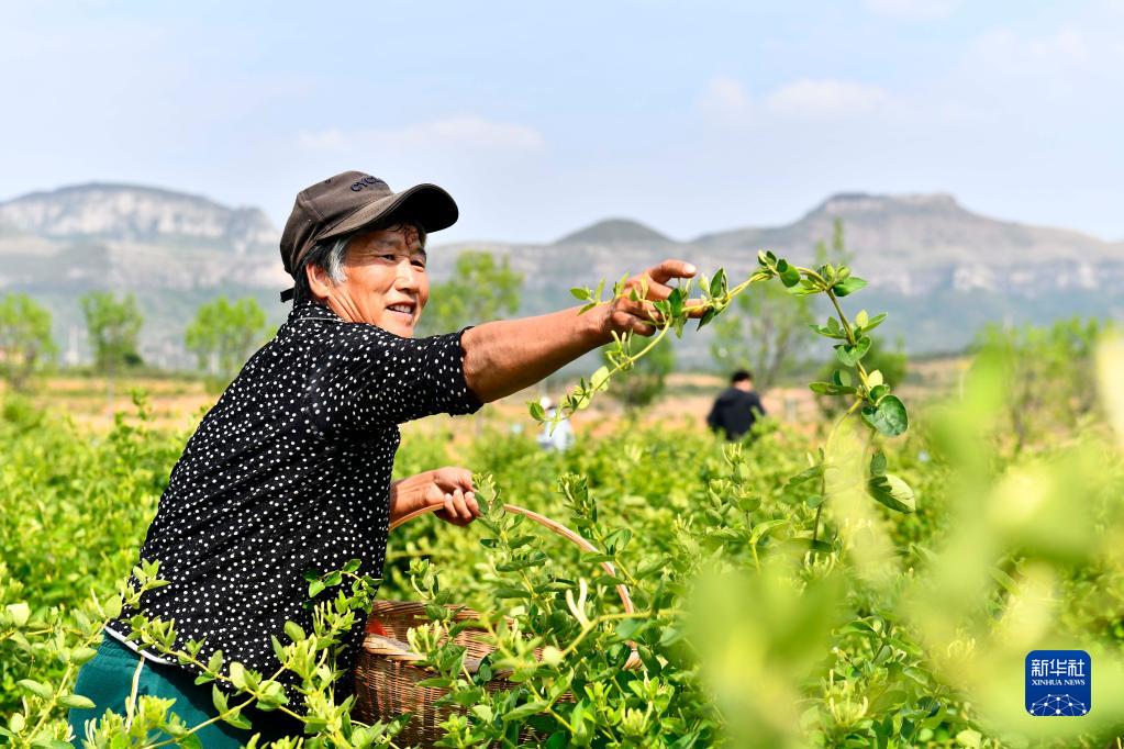5月22日,在臨沂市平邑縣鄭城鎮,村民在采摘金銀花。新華社記者郭緒雷攝