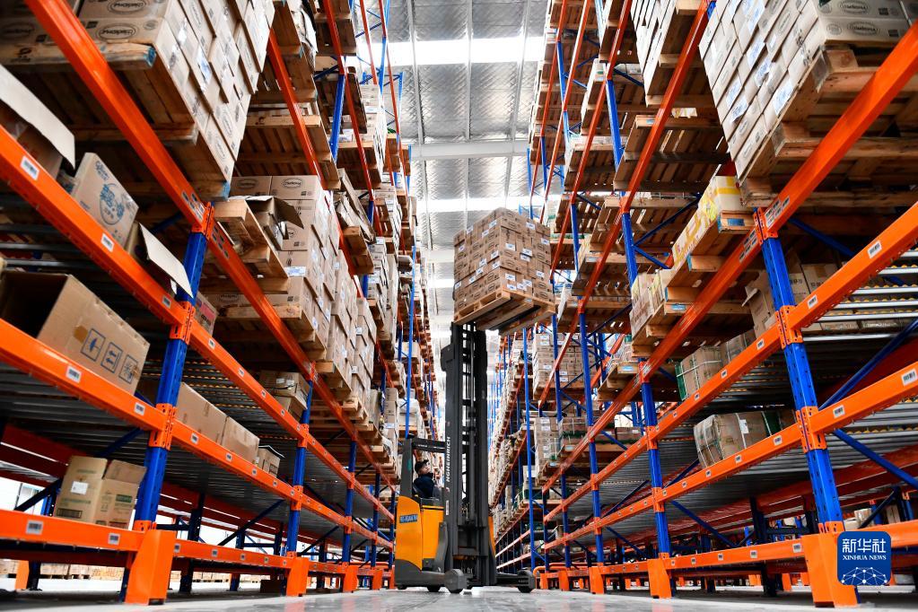 在臨沂商谷羅濱遜智慧物流園1號云倉,工作人員在貨架上取貨物(2020年11月21日攝)。新華社記者 郭緒雷 攝
