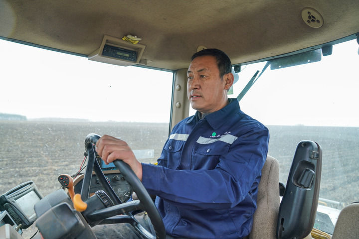 2023年4月12日,在黑龍江省北安市的北大荒集團建設農場有限公司一處農田中,許志國駕駛大型拖拉機進行分層定量施肥作業。新華社記者 王松 攝