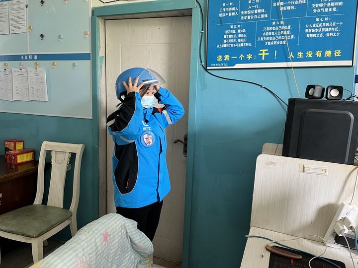 2023年4月24日,在寧夏銀川,外賣女騎手丁國梅在站點內整理著裝,為即將到來的送餐高峰做準備。新華社記者 任瑋 攝