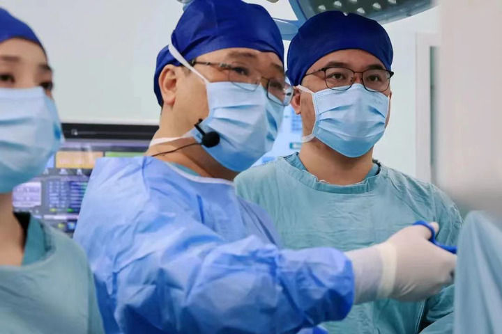湖南省人民醫院肝膽胰微創外科主任尹新民(中)在工作中(資料照片)。新華社發