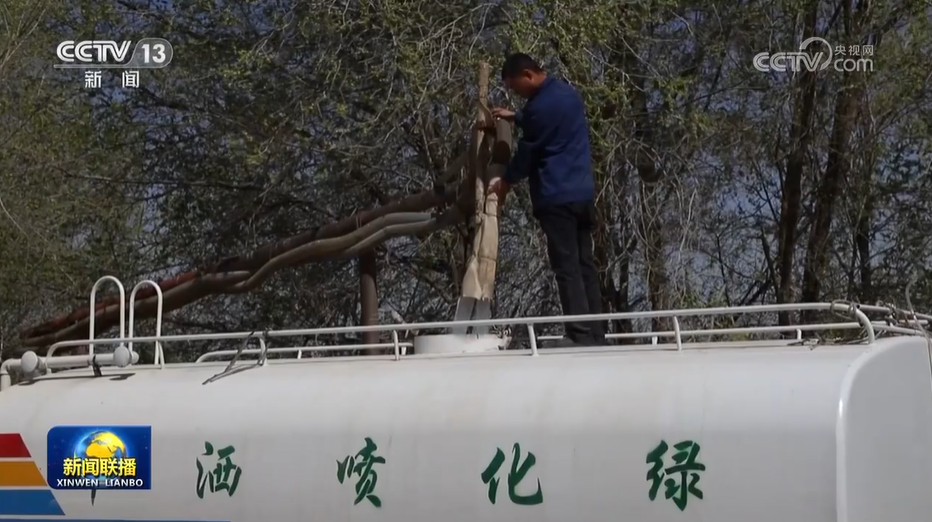在甘肅八步沙林場,曾經(jīng)寸草不生的沙漠被嫩綠的沙生植物所覆蓋。眼下,林場職工正抓住時(shí)機(jī),為今年新栽的樹苗澆“安苗水”。