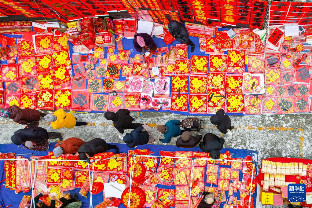 1月22日,人們在山東省青島市李村大集選購春節飾品(無人機照片)。春節臨近,各地張燈結彩。人們逛花市、賞花燈、置辦年貨,年味漸濃。新華社發(張鷹攝)