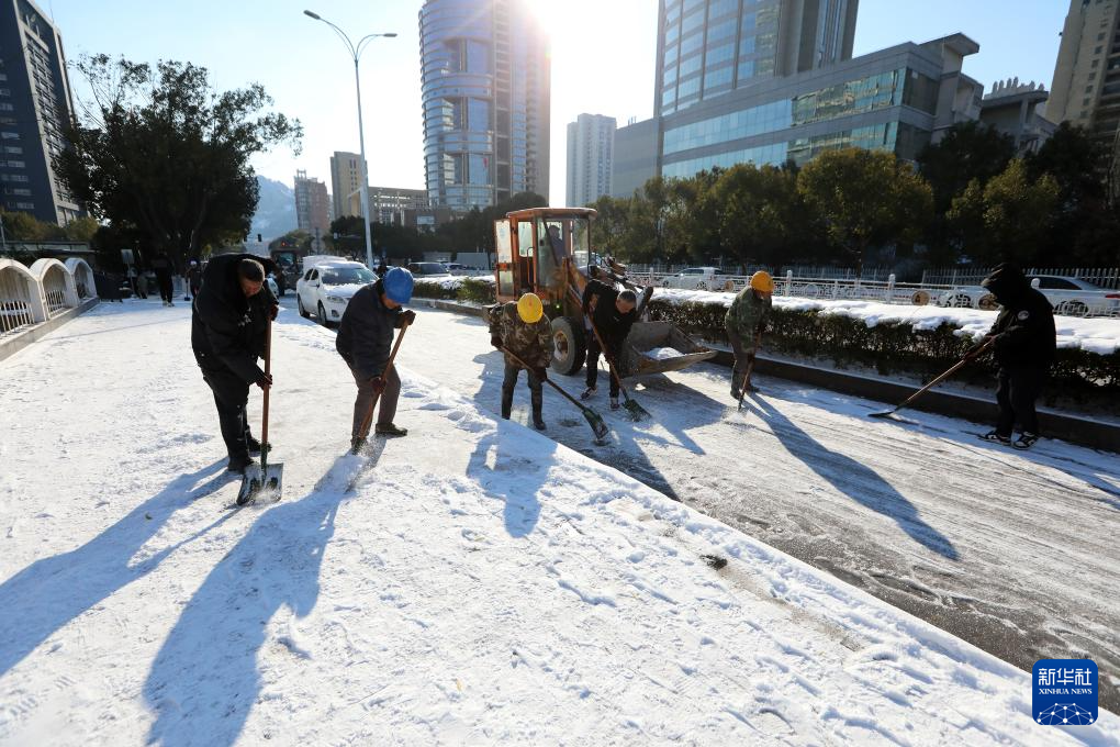 1月23日,在浙江省溫嶺市,人們在清除路面冰雪。近日,受寒潮天氣影響,我國多地迎來降溫降雪天氣,各地積極組織相關部門開展抗凝除雪工作,保安全保暢通。新華社發(周學軍攝)