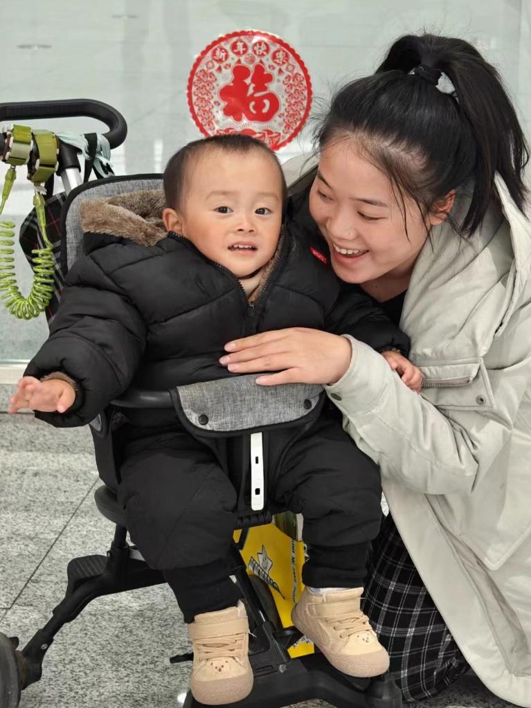 26歲的軍嫂羅國容一年沒見過丈夫了,今年春節(jié)她要去新疆和丈夫團聚。抱著1歲半的孩子,羅國容和媽媽一起乘地鐵到天府機場,先送媽媽上了回自貢的高鐵,自己和寶寶再去候機。