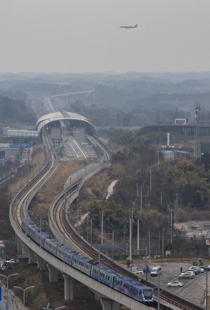 1月26日,成都天府國際機場上空,一架飛機與軌道交通同框。新華社記者 江宏景 攝