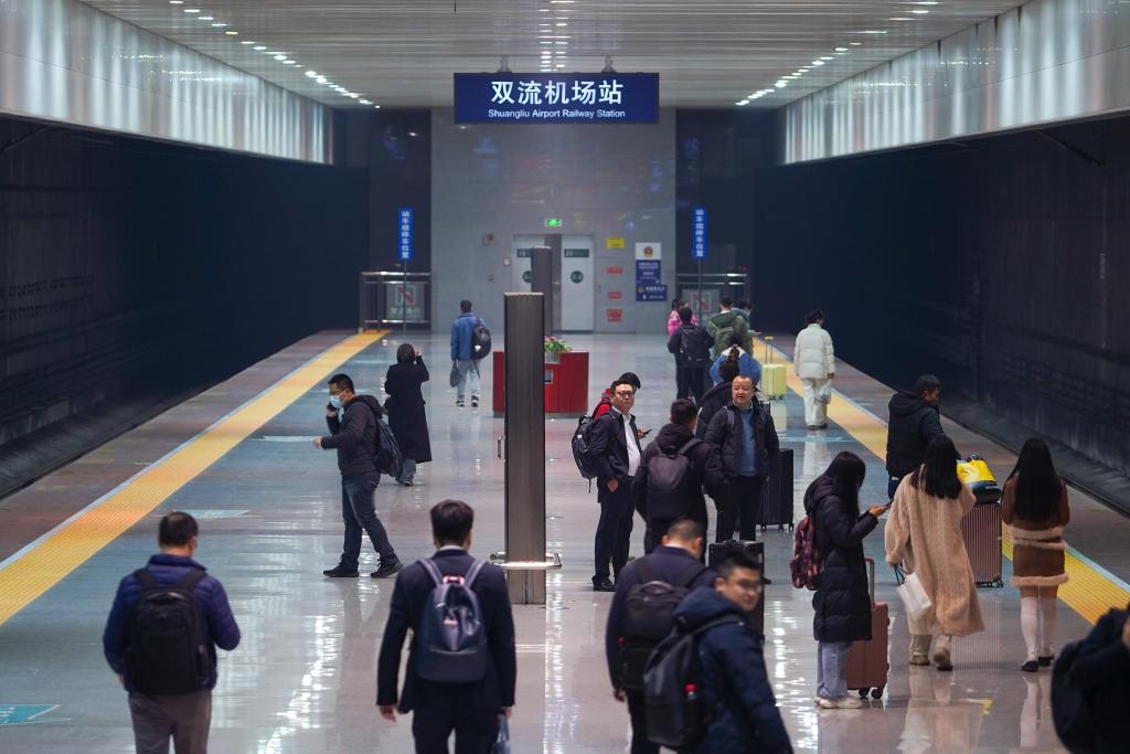 1月26日21時許,旅客們在鐵路雙流機場站的站臺上等候列車。新華社發(fā)