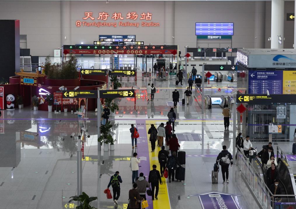 1月26日,天府機場綜合交通換乘中心,在這里地鐵、高鐵等多種交通方式無縫換乘。新華社記者 江宏景 攝