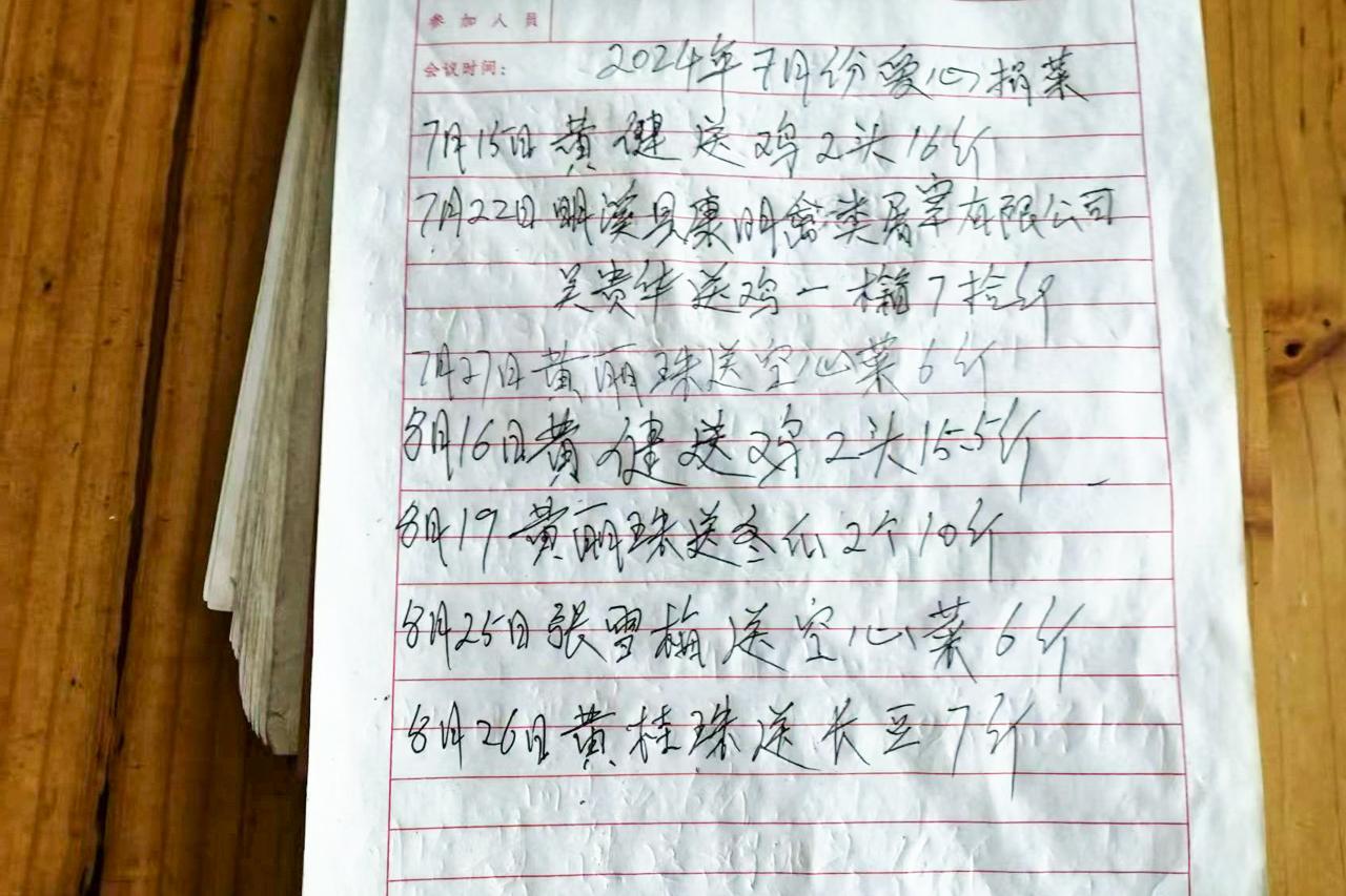 央視網消息(記者 陳麗霞)“8月16日,黃健送雞2只共15.5斤;8月25日,張雪梅送空心菜6斤;8月26日,黃桂珠送長豆7斤……”翻開“好人好事記錄本”,幾十頁的本子密密麻麻地記錄著村民們送來的各類愛心物資。這些文字不僅僅是食材名稱與數量的簡單堆砌,更在無聲講述三明市明溪縣沙溪鄉梓口坊村村民們對“老吾老以及人之老”傳統美德的深刻理解。