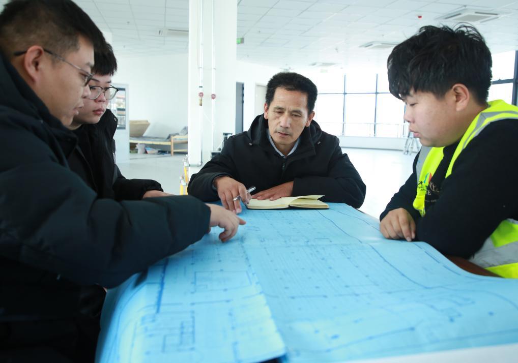 在項目部內,周培(右二)和工作人員對工程操作注意事項進行研討。(受訪者供圖)