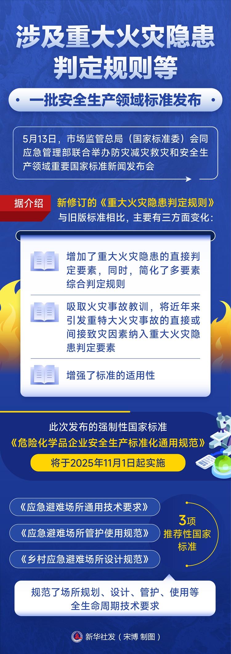 2025-05-14 09:51:08 來源:新華網新華社北京5月13日電 題:涉及重大火災隱患判定規則等 一批安全生產領域標準發布