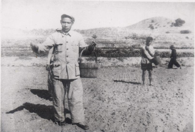 谷文昌(左)在田間與農民一起勞動(資料照片)。