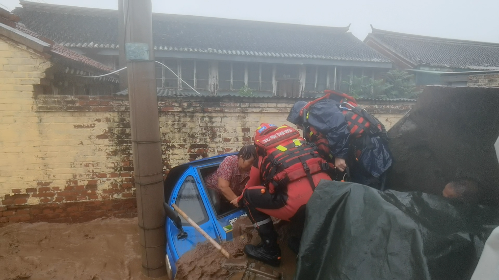 7月28日,消防救援人員在葡萄園村路口營救一名被困在三輪車里的群眾。(密云消防供圖)