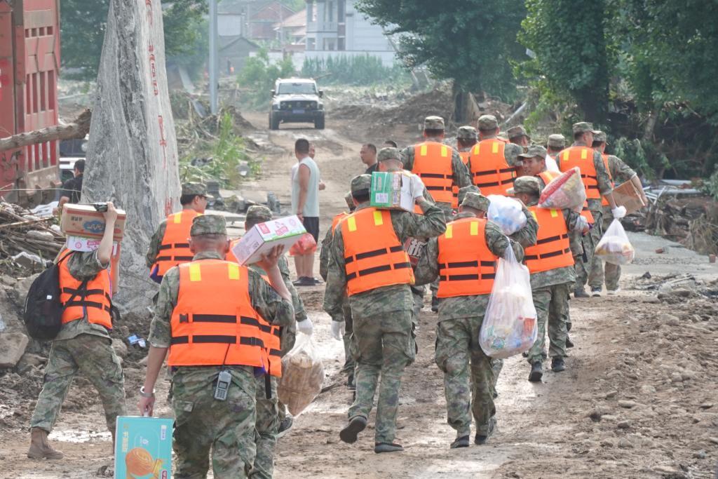 7月28日,救援人員在徒步奔赴受災村莊。新華社記者 范世輝 攝