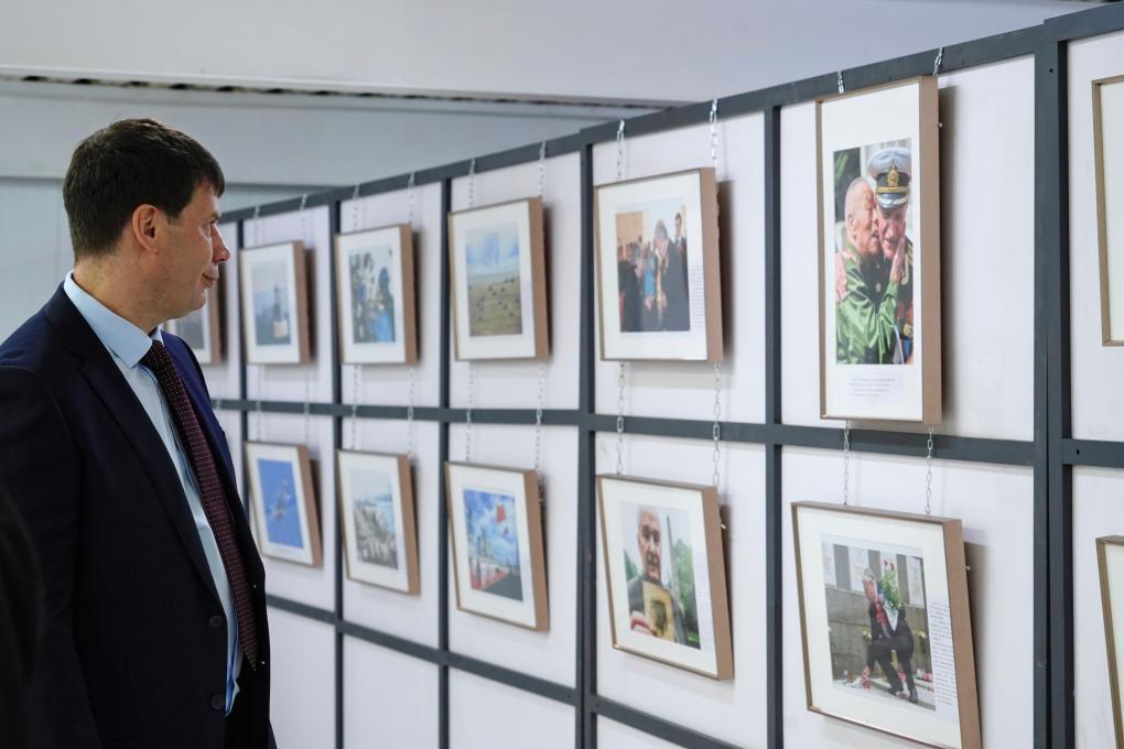 8月28日,在俄羅斯圣彼得堡,一名男子參觀紀念中國人民抗日戰爭暨世界反法西斯戰爭勝利80周年圖片展。新華社記者 周天翮 攝