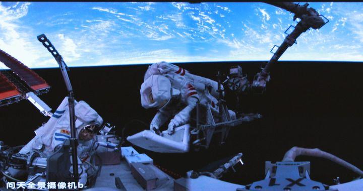 這是2025年6月26日在北京航天飛行控制中心屏幕上拍攝的神舟二十號航天員陳冬(左)與陳中瑞在空間站組合體艙外工作的畫面。新華社發(周柯毅攝)