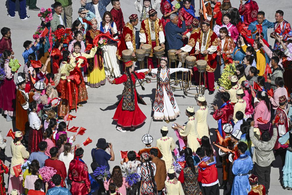 新華社記者的鏡頭里,各族兒女簇擁在一起,歡笑在一起;明艷的服飾、熱烈的歌舞,無不展現出團結與奮進的力量。