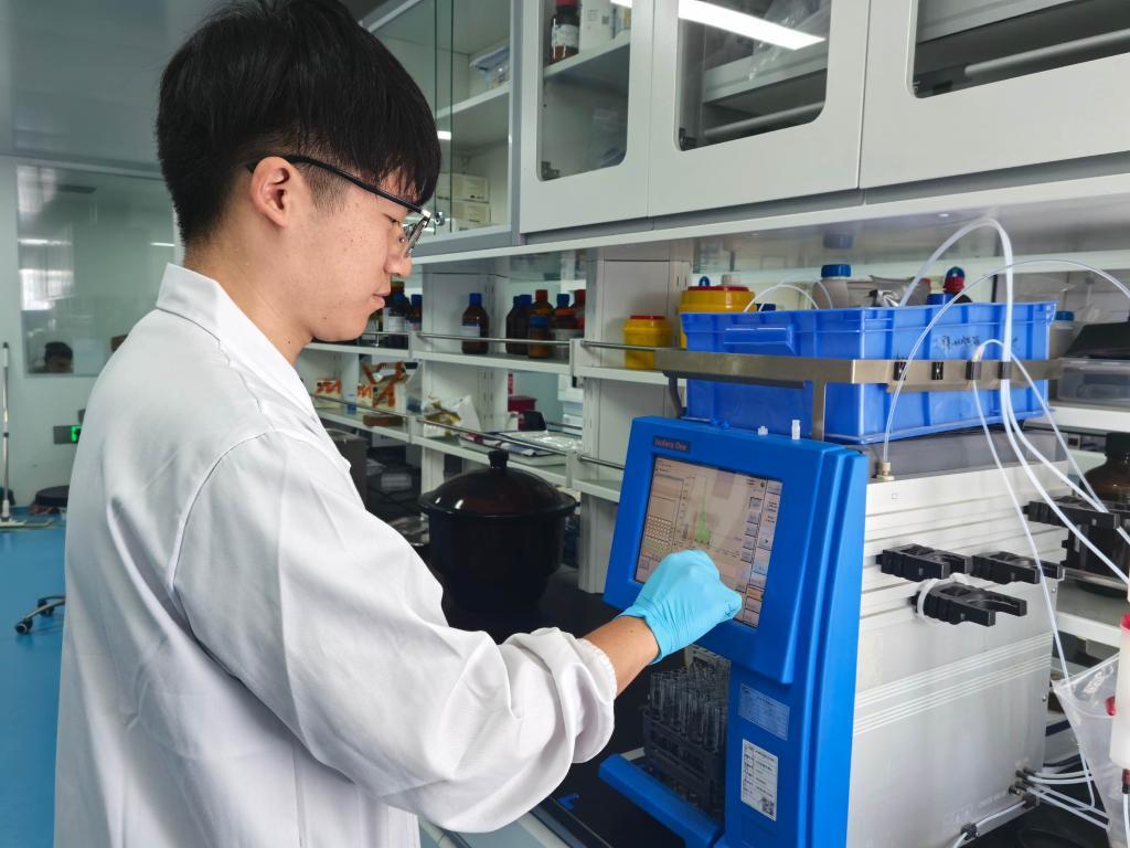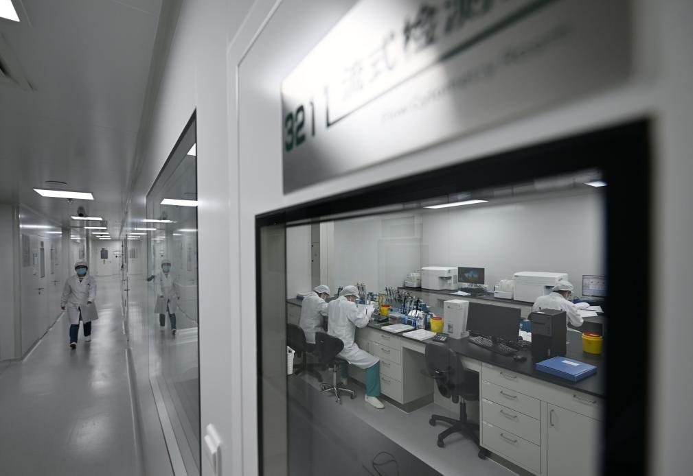 合源生物科技(天津)有限公司工作人員在生產基地的檢測室進行檢測。新華社記者 趙子碩 攝