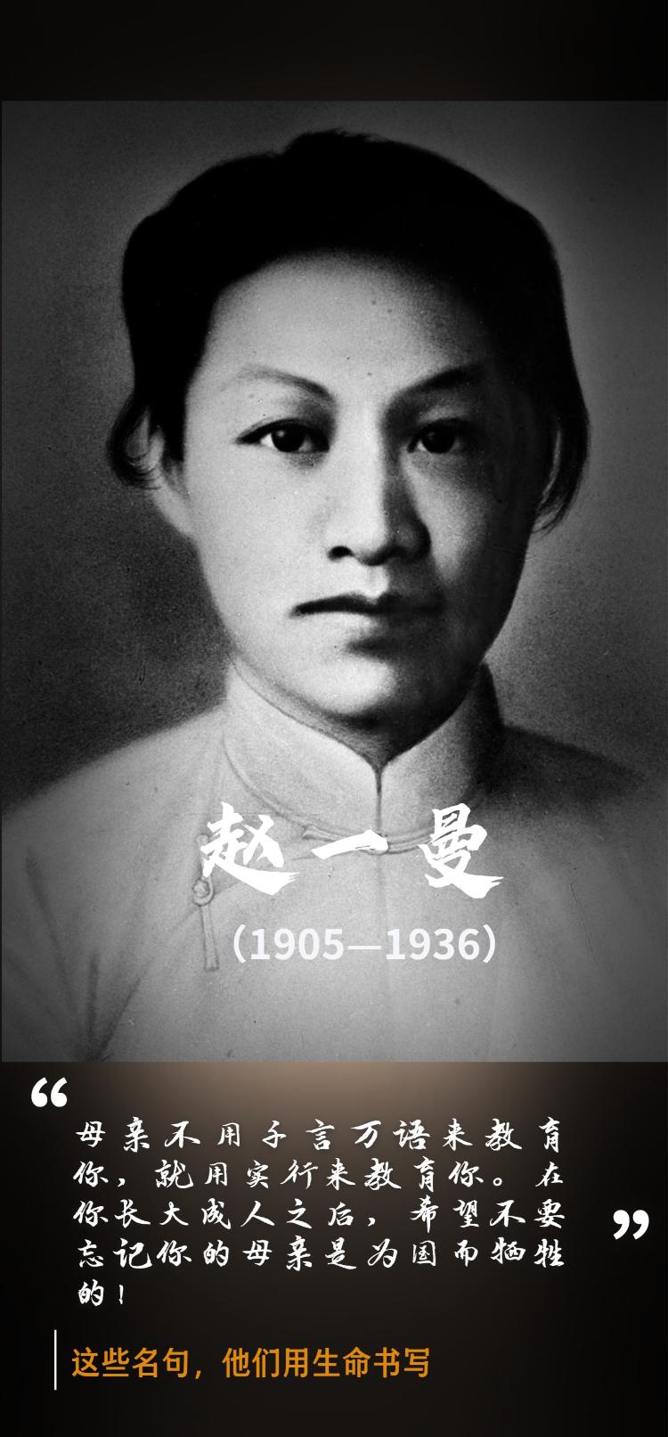 趙一曼,原名李坤泰,1905年10月25日出生在四川宜賓的一個地主家庭。1923年冬,趙一曼加入中國社會主義青年團。1926年夏加入中國共產黨。 1935年秋,趙一曼任東北抗日聯軍第3軍1師2團政治委員。11月間,第2團被日偽軍圍困于一座山間。趙一曼為掩護部隊突圍,身負重傷,養傷期間被日軍發現,戰斗中再度負傷,昏迷被俘。1936年8月2日,趙一曼壯烈犧牲,年僅31歲。