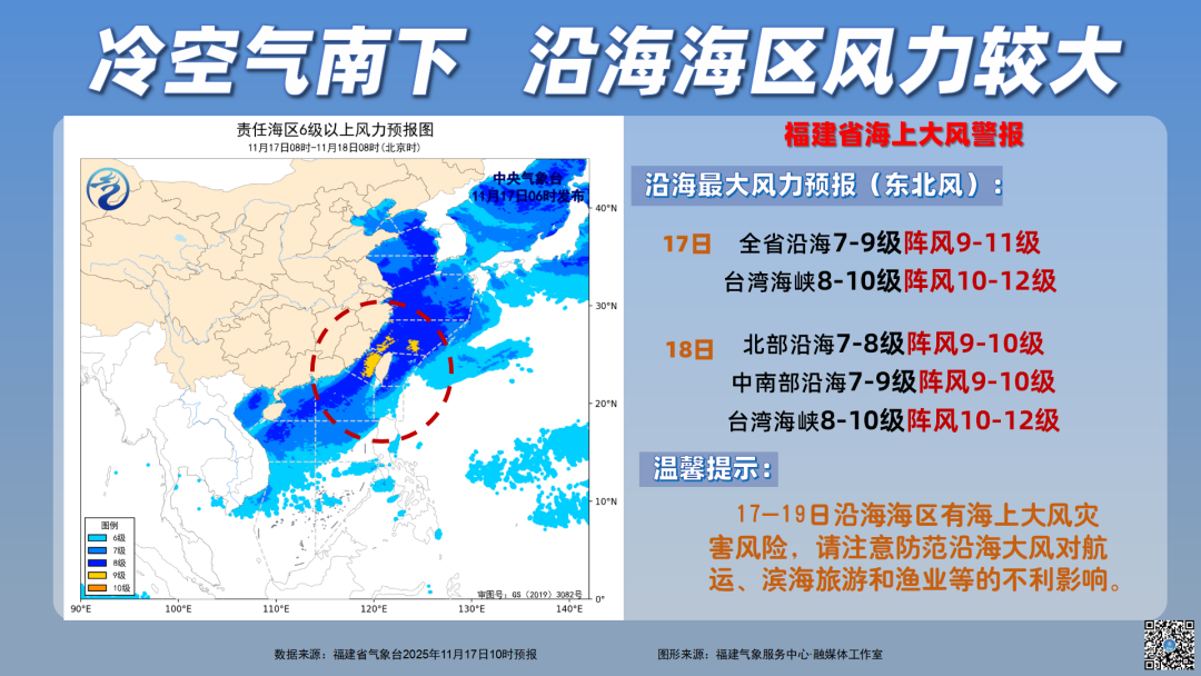 17~19日沿海海區有海上大風災害風險,請注意防范沿海大風對航運、濱海旅游和漁業等的不利影響。