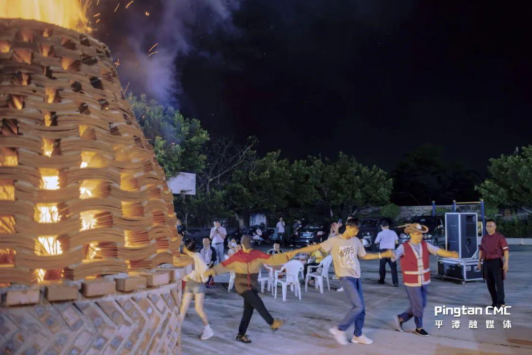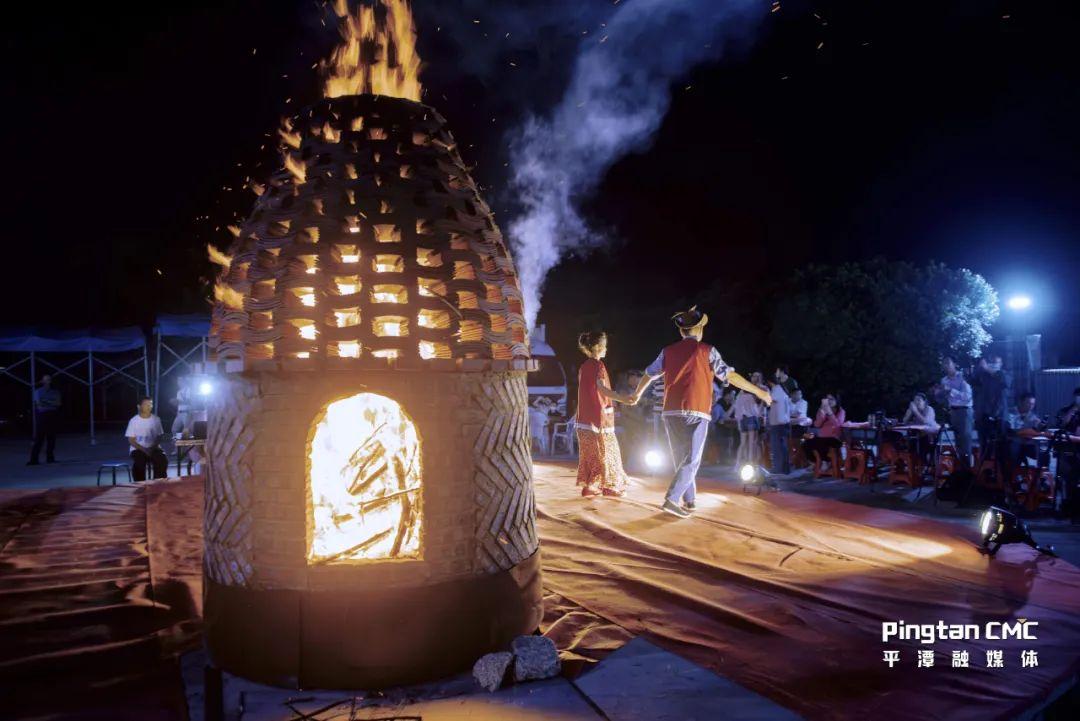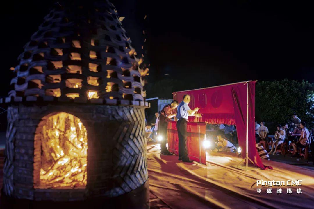 伴著“咿咿呀呀”的詞明戲的唱詞,提著木偶的詞明戲藝人在舞臺上表演:“蟠桃已熟,摘來獻神仙……”小小的帷幕前,詞明戲《偷桃》隨著一陣熱鬧的鑼鼓開場,只見四名藝人手指輕盈擺動,一具具木偶躍入戲臺,配以聲情并茂的演唱,靈動的身影讓人目不暇接。另外一側(cè),火光紅艷的燒瓦塔處,人們把粗粒的海鹽大把大把地撒向塔里,瓦塔發(fā)出像鞭炮一樣的噼啪響聲,火光四濺,照耀如晝,十分壯觀,十里八鄉(xiāng)的鄉(xiāng)鄰都趕來欣賞。