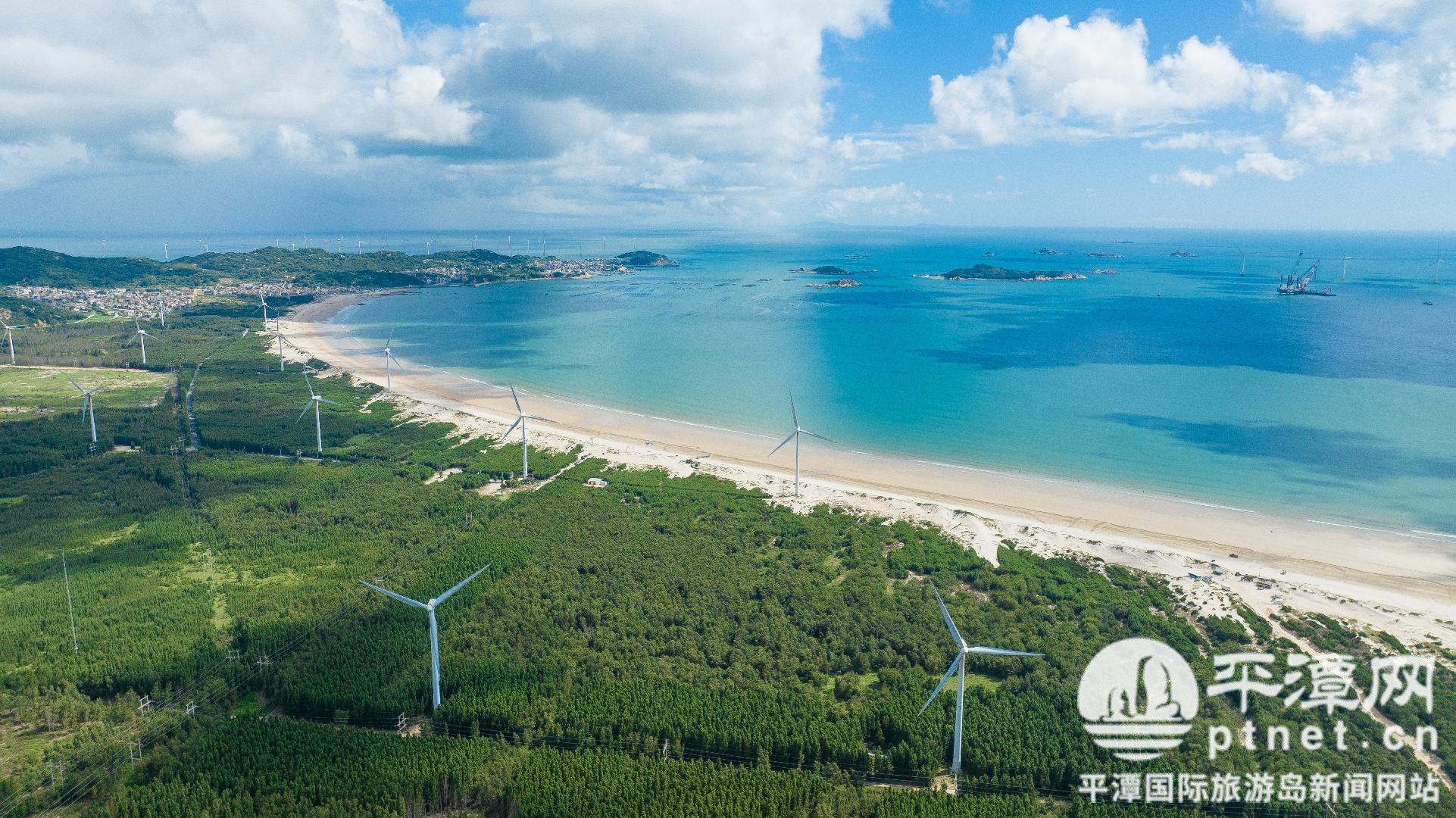 漫步在柔軟沙灘,腳下細沙簌簌。湛藍大海波光閃爍,潔白風車靜立綠野。這如夢之境,便是平潭長江澳 。