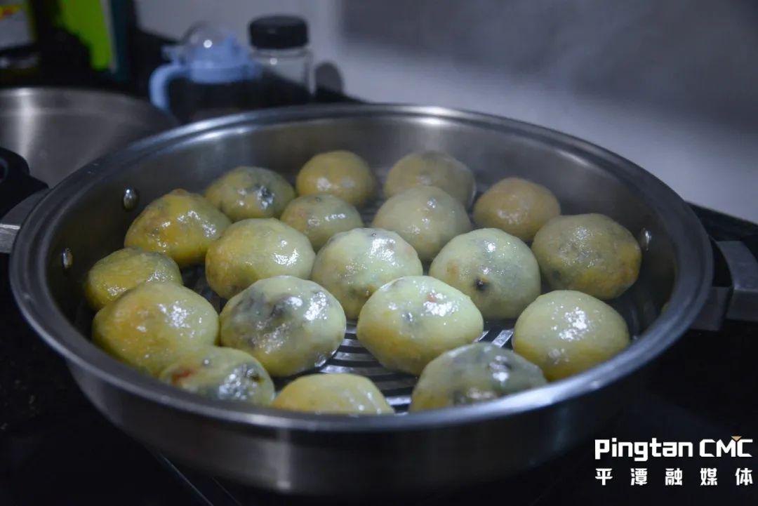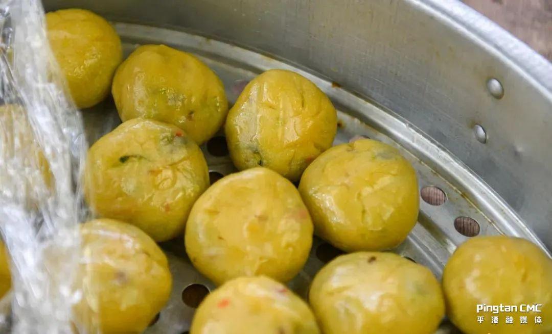在平潭老街上,我見(jiàn)過(guò)七十多歲的阿婆做“時(shí)來(lái)運(yùn)轉(zhuǎn)”的全過(guò)程:她先將紅心地瓜蒸得爛熟,趁熱摻入本地特產(chǎn)地瓜粉,那面團(tuán)在她手里翻來(lái)滾去,仿佛被賦予了生命。接著揪下小塊,在掌心搓圓、壓扁,再用搟面杖輕輕搟成薄薄的圓皮。餡料格外講究——清晨剛撈的蝦蛄剝?nèi)猓r嫩的海蠣、噴香的肉末,本港紫菜用花生油煸香,就連包菜都現(xiàn)摘現(xiàn)切,保持著爽脆的口感。阿婆包餡時(shí)總念叨:“皮要搟得中間厚四周薄,這樣蒸的時(shí)候才不會(huì)破肚皮。”最后她把皮兒一合,指尖捏出漂亮的褶皺,像在折疊海浪的紋路,一個(gè)“時(shí)來(lái)運(yùn)轉(zhuǎn)”便在她手中誕生了。