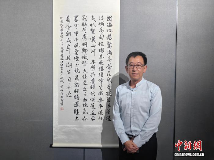 臺灣書法家韋仰哲展出了其今年創(chuàng)作的書法作品《滿江紅·寶島千秋賦》。他受訪時說:“海峽兩岸一衣帶水,同胞血脈相連,這首詞講述了寶島臺灣民眾抵抗外辱的歷史??箲?zhàn)時期,父親響應(yīng)‘一寸山河一寸血,十萬青年十萬軍’的號召,從軍報國。作為抗戰(zhàn)戰(zhàn)士的后代,我深知抗日戰(zhàn)爭是兩岸同胞的共同記憶,歷史不能扭曲或遺忘,我們要銘記歷史、珍惜和平?!?/p>