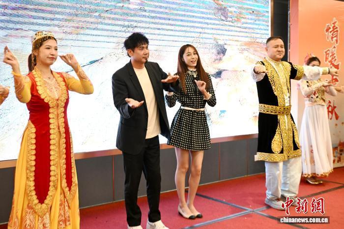 25日,新疆串燒舞《我從新疆來》表演節(jié)目中,新疆表演者邀請臺胞吳軍(左二)登臺共舞。 中新社記者 呂明 攝
